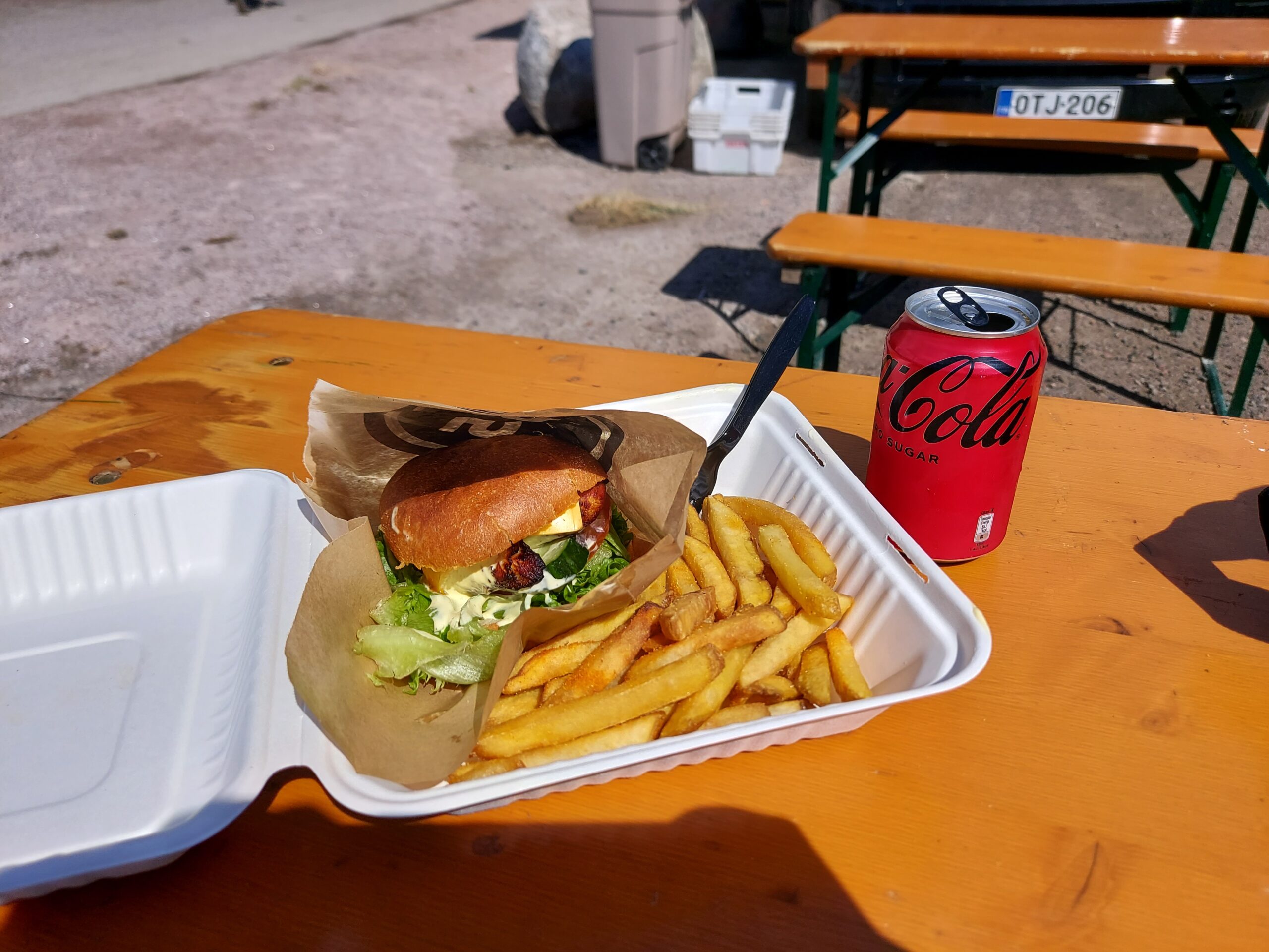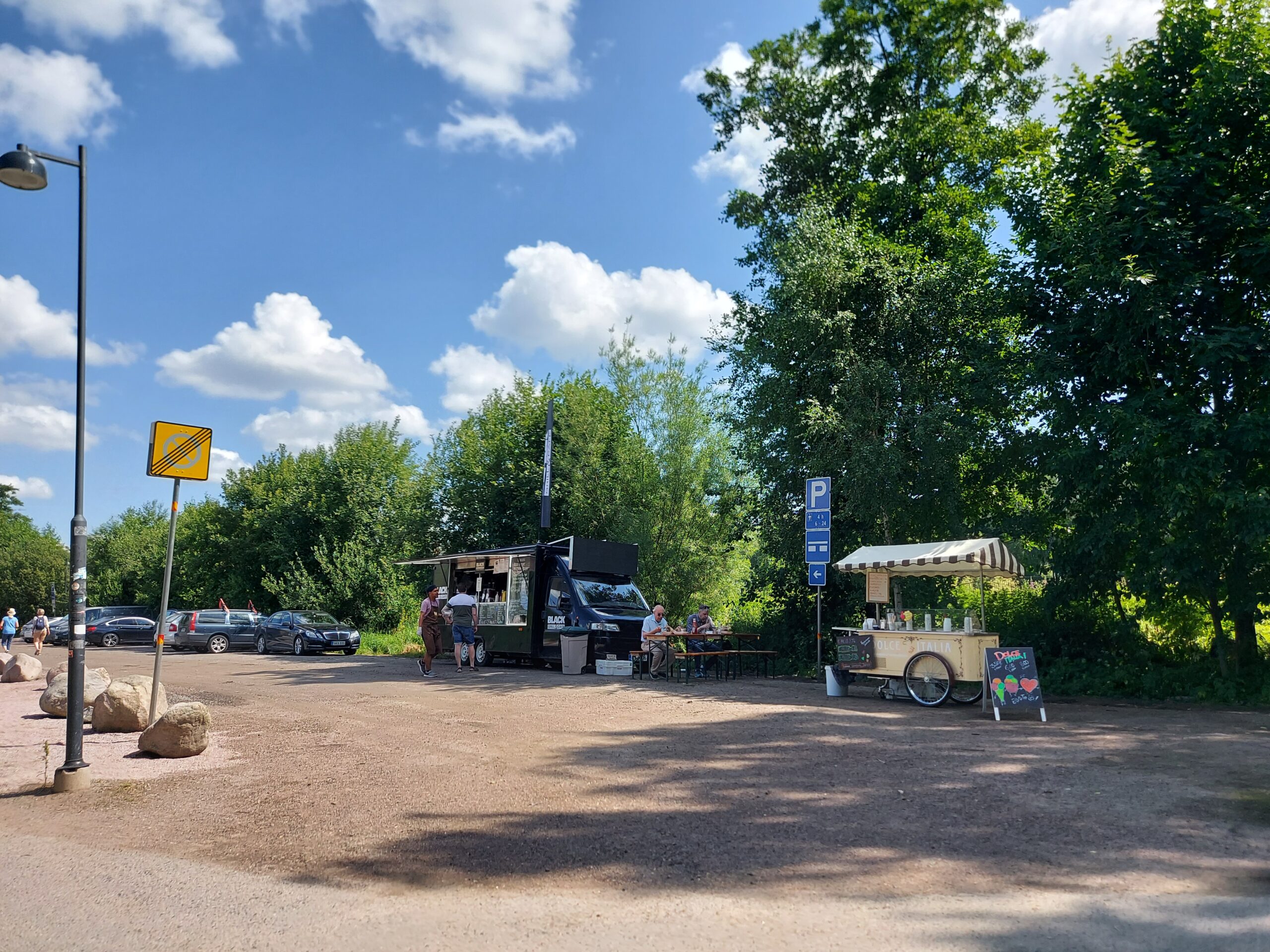 Ennen pitkää tuli tietysti nälkä ja huomasin, että alueelle itse asiassa alkoi puolen päivän aikaan ilmaantua enemmänkin lounastajia. Mukavasti pöytään pääsee istumaan aivan Tekniikan museon naapurissa sijaitsevaan Ravintola Koskenrantaan, mutta siitä kivenheiton päähän Jokisuuntien parkkipaikan tienoille on muodostunut myös rennon lounastamisen keitaaksi erilaisten ruokarekkojen ja -kojujen keskittymä. Ruokaisten annosten lisäksi kojuista sai pienempää syötävää, kahvia sekä jäätelöä – kaikkea kesäpäivänä maistuvaa.